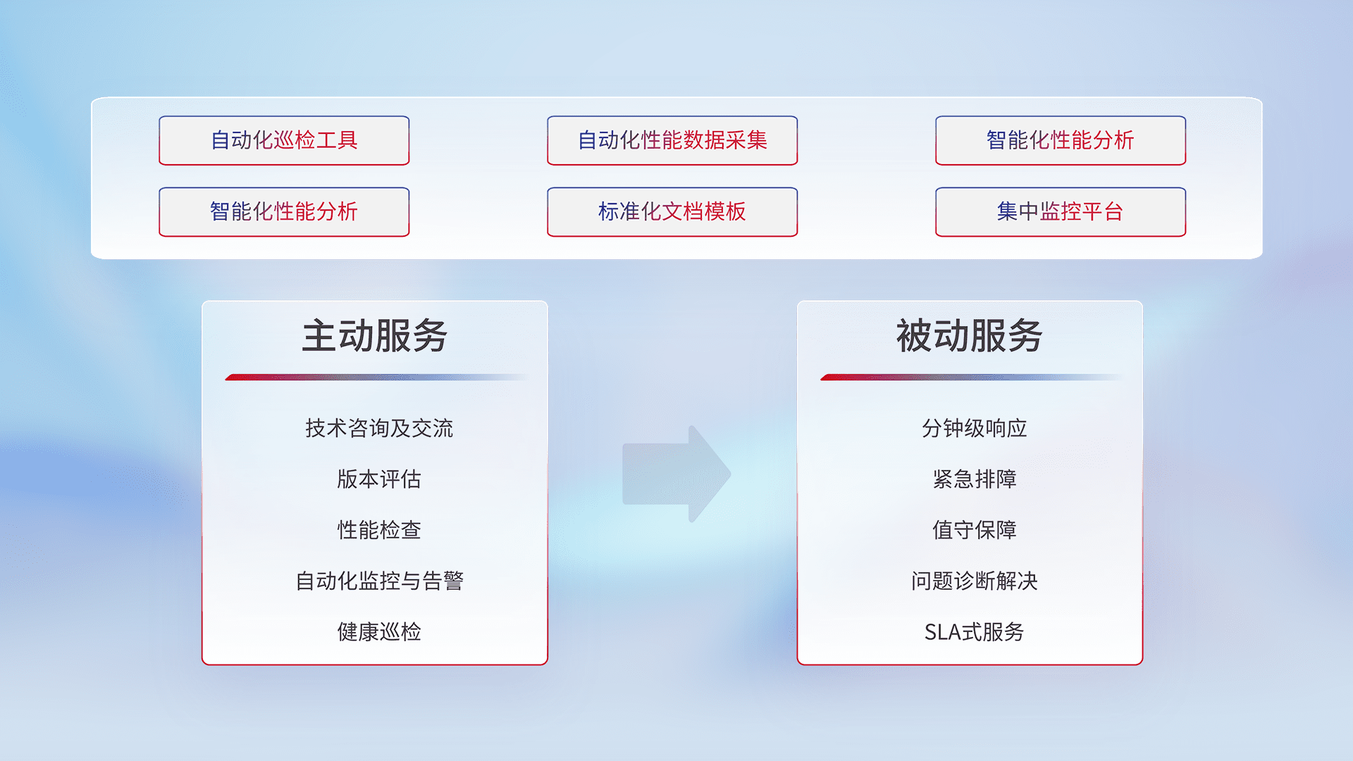 智能化工具和标准化文档,,,,保障服务质量,,提供主动服务(包含技术咨询、、、版本评估、、性能检查、、、自动化监控与告警、、、、健康巡检)和被动服务包含(分钟级响应、、、紧急排障、、、、值守保障、、、、问题诊断解决、、、SLA服务)。。。。